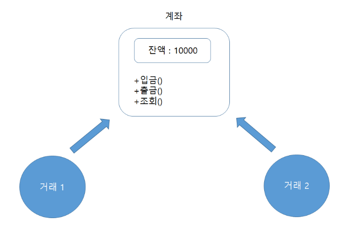 예를 들어, 계좌에 잔액이 10000원일 때, 거래 1 스레드가 +1000원 요청을 발생 시키고, 거래 2 스레드가 -1500원 요청을 발생시켰다고 가정해봅시다. 이러한 경우, 최종 결과는 10000+1000-1500 = 9500원이 되어야 합니다. 하지만, 공유 데이터가 동기화하지 않은 상황에서는 거래1 스레드가 10000원을 가져와 11000원으로 먼저 업데이트하고, 거래2 스레드도 마찬가지로 10000원을 가져와 8500원을 업데이트해서, 최종 결과가 8500원이 되는 데이터 불일치가 발생할 수 있습니다.