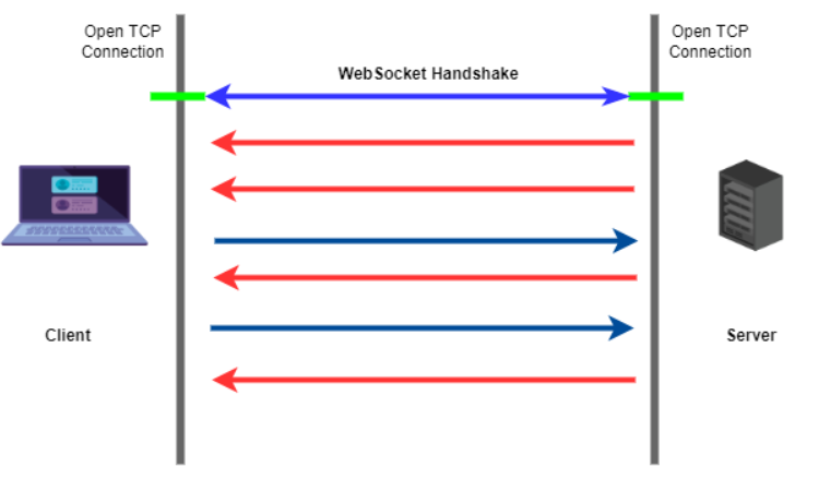 - 웹소켓은 SSE와는 다르게 양방향 통신을 지원합니다. 즉, 클라이언트->서버, 서버->클라이언트 통신이 가능합니다.