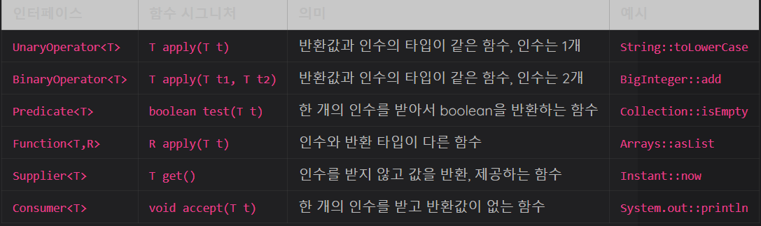 다음은 이 기본 함수형 인터페이스들을 정리한 표다.