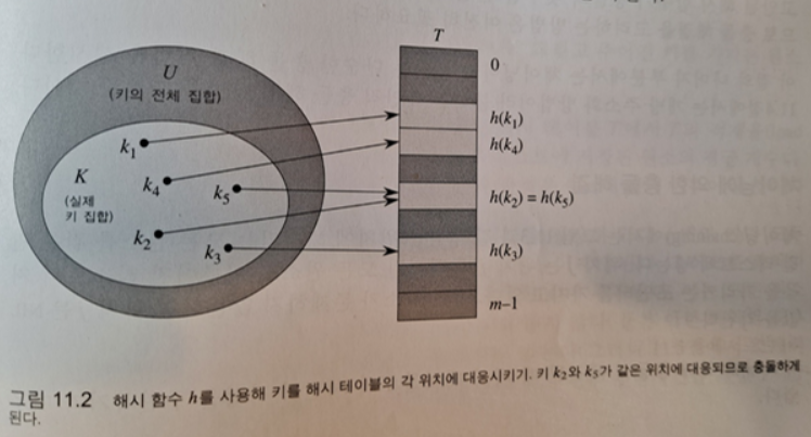 여기서 h는 키들의 전체 집합 U를 해시 테이블 T[0...m-1]의 각 위치에 대응시킨다.