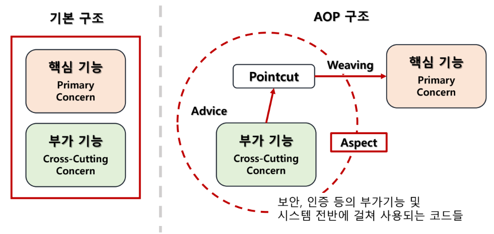 - 관점 지향 프로그래밍(AOP)은 객체 지향 프로그래밍(OOP)을 보완하여 프로그램 구조에 대해