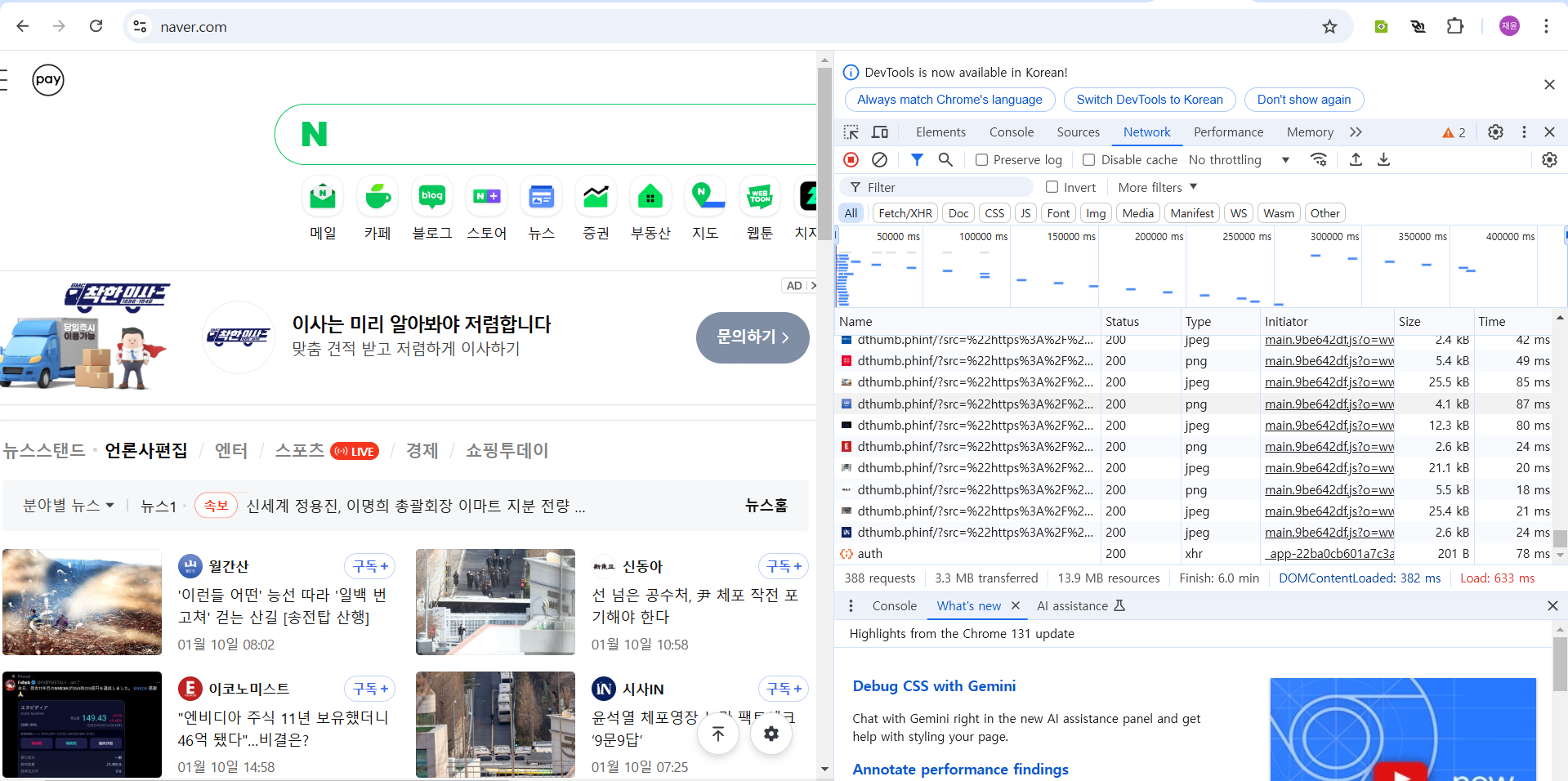 네이버 홈페이지가 표시되기위해 몇개의 파일이 필요할까요?