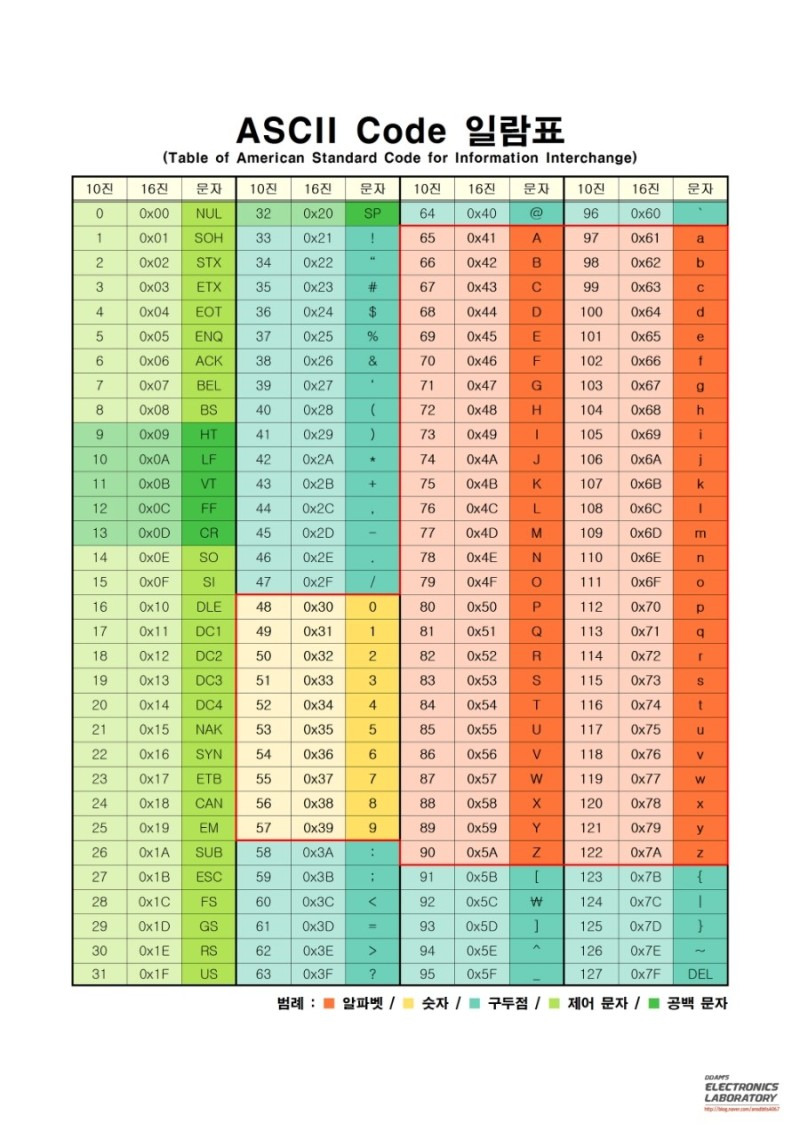 - 아스키 코드 표에서 몇 가지 재미있는 코드가 눈에 띄었을 것이다.