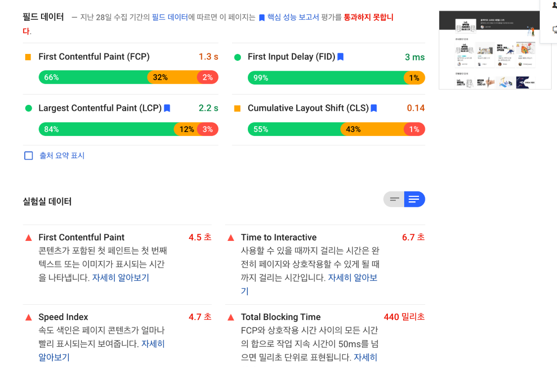 (2) PageSpeed를 활용하여 Desktop, Mobile 사이트 등에서 측정된 FCP, TTI 등의 지표를 확인합니다.