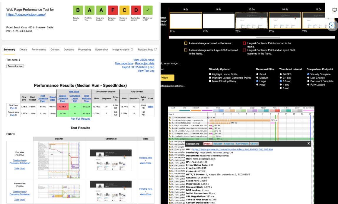 - WebPageTest 를 사용하면 연결을 시도하는 위치, 환경부터 Repeat View(캐싱 등 테스트),