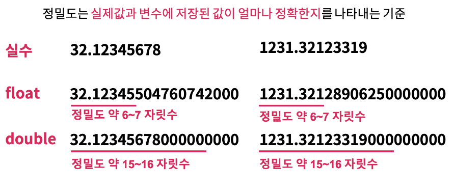 이 때, float은 32비트, double은 64비트 자료형입니다.