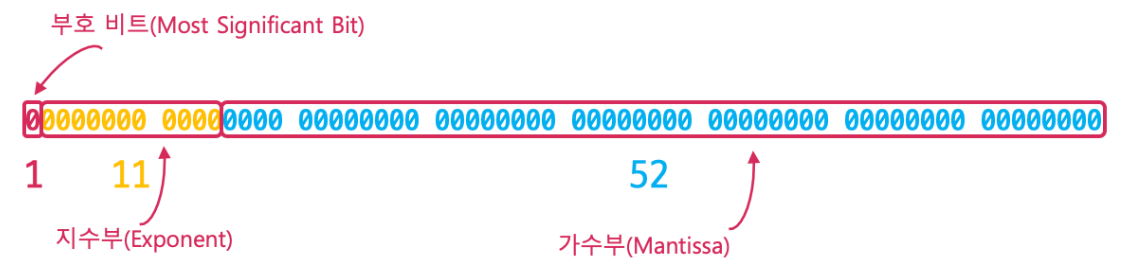 배정도 방식은 부호 비트(1) + 지수부(11) + 가수부(52) = 64비트로 구성됩니다.