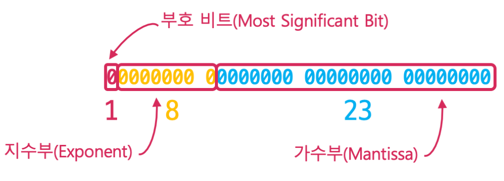 - 즉, float은 단일 정밀도(단정도) 32 bit 부동 소수점 방식이고,