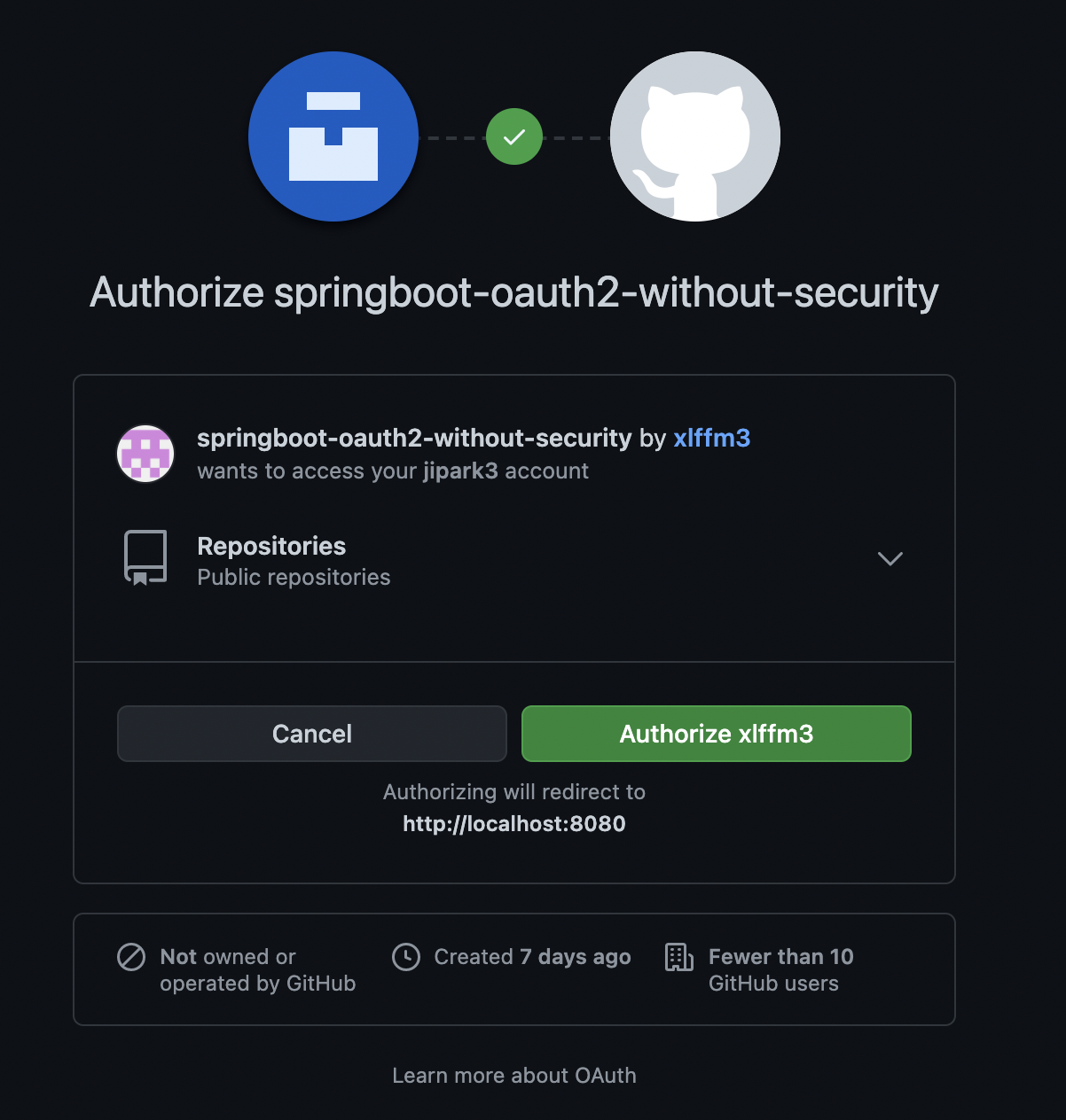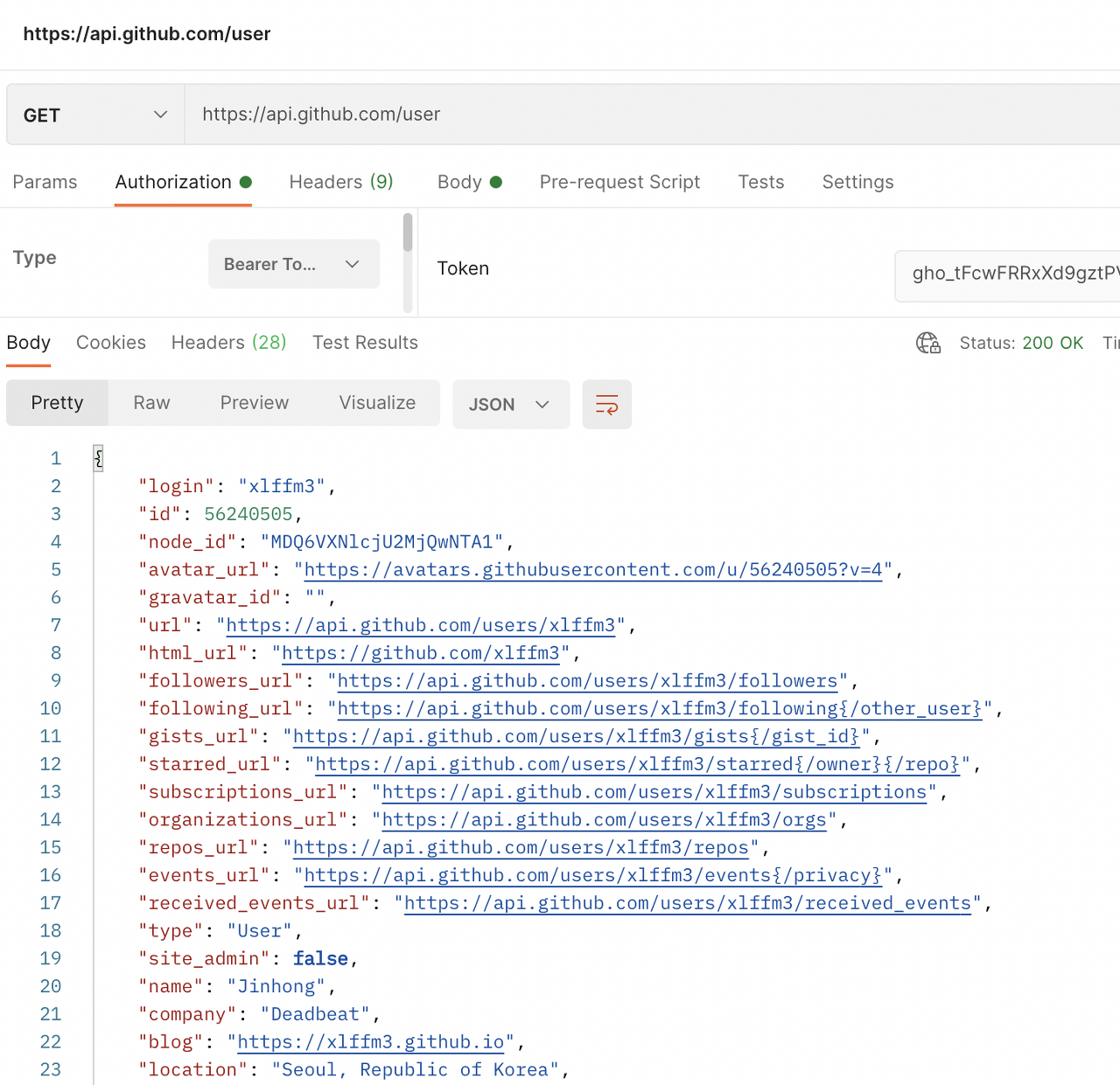 - 이후 Access Token을 헤더에 담아 Github API를 호출하면 해당 계정과 연동된 Resource Server의 풍부한 자원과 기능들을 내가 만든 웹 애플리케이션에서 사용할 수 있습니다.
