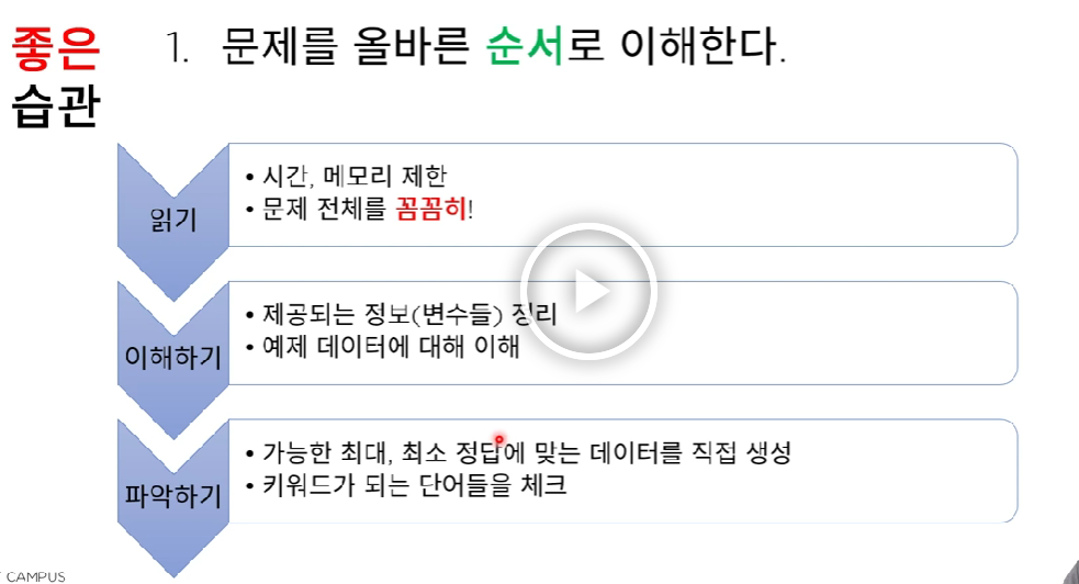 - 문제를 이해하고, 기능성과 효율성을 따져서 문제가 원하는 정답을 구하는 방법을 찾고,
